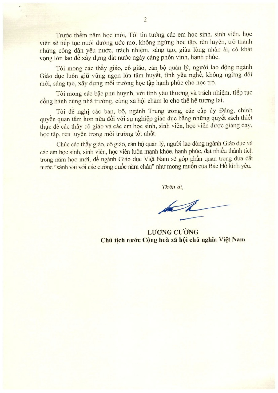 Trước thềm năm học mới, Tôi tin tưởng các em học sinh, sinh viên, học viên sẽ tiếp tục nuôi dưỡng ước mơ, không ngừng học tập, rèn luyện, trở thành những công dân yêu nước, trách nhiệm, sáng tạo, giàu lòng nhân ái, có khát vọng lớn lao để xây dựng đất nước ngày càng phồn vinh, hạnh phúc.