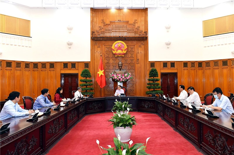 Tại buổi làm việc, Thủ tướng Phạm Minh Chính đề nghị Công ty AstraZeneca quan tâm, tạo mọi điều kiện thuận lợi nhất để Việt Nam có được ít nhất 10 triệu liều vaccine phòng chống COVID-19 từ nay đến đầu tháng 8/2021 - Ảnh: VGP/Nhật Bắc