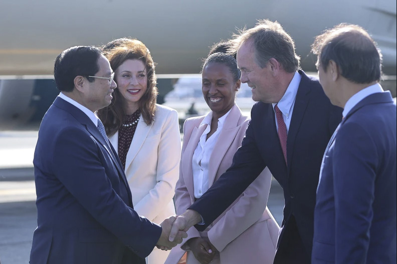 Đón Thủ tướng Phạm Minh Chính tại sân bay quốc tế San Francisco có đại diện thành phố San Francisco, Đại sứ Việt Nam tại Hoa Kỳ Nguyễn Quốc Dũng, Tổng Lãnh sự Việt Nam tại San Francisco Hoàng Anh Tuấn và một số cán bộ Tổng Lãnh sự quán.