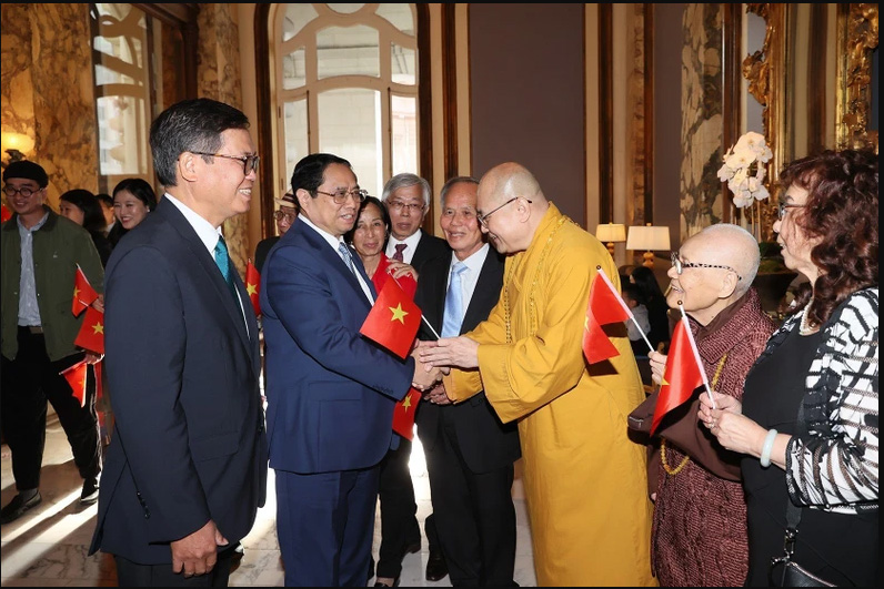 Bà con Việt kiều đón Thủ tướng Phạm Minh Chính tại khách sạn. (Ảnh: DƯƠNG GIANG)