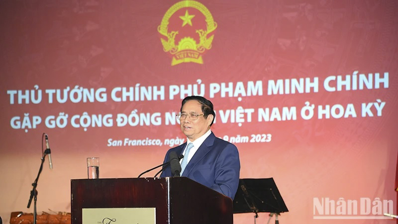 Phát biểu ý kiến tại buổi gặp mặt, bày tỏ vui mừng được gặp gỡ cộng đồng người Việt Nam tại San Francisco và các vùng lân cận; thay mặt Đảng và Nhà nước, Thủ tướng Phạm Minh Chính gửi tới tất cả các đại biểu có mặt tại buổi gặp gỡ ngày hôm nay cùng toàn thể bà con ta ở Hoa Kỳ lời chúc sức khỏe, hạnh phúc và thành đạt. Nhân dịp này, Thủ tướng chuyển lời thăm hỏi của Tổng Bí thư Nguyễn Phú Trọng, các đồng chí Lãnh đạo Đảng, Nhà nước tới bà con đang sinh sống tại Hoa Kỳ nói chung, San Francisco nói riêng.