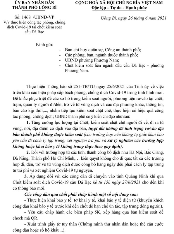 Mới đây, Ủy ban nhân dân thành phố Uông Bí ban hành văn bản số 1468/UBND-VP về việc thực hiện công tác phòng, chống dịch Covid-19 tại chốt kiểm soát cầu Đá Bạc.