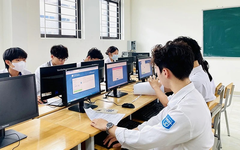 Học sinh lớp 12, Trường THPT Trương Định (Hoàng Mai, Hà Nội) thử đăng ký dự thi tốt nghiệp THPT trên hệ thống quản lý thi, sáng 24/4. (Ảnh MAI MAI)