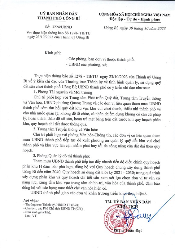 Công văn số 3224/UBND ngày 30/10/2023 của Ủy ban nhân dân Thành phố Uông Bí V/v thực hiện thông báo số 1278-TB/TU ngày 23/10/2023 của Thành uỷ Uông Bí.