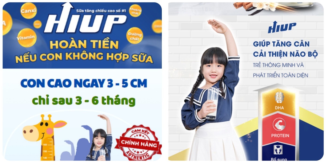 Hay tại website, tangchieucaohiup.online, Hiup được quảng cáo: "Bứt phá 3-5cm sau 3 tháng sử dụng", "Tăng chiều cao hiệu quả, cải thiện não bộ cho bé, hỗ trợ tiêu hóa". Trang này cũng khẳng định: "Hiệu quả gấp 200 lần canxi thông thường".