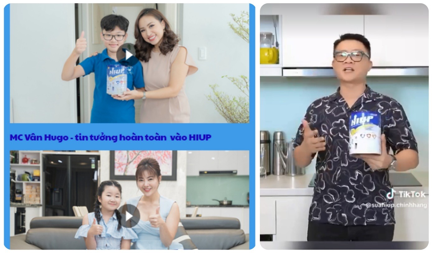 Tại nhiều video quảng cáo sản phẩm Hiup trên website suahiupchinhhang.com sử dụng hình ảnh của một số người nổi tiếng như diễn viên Nguyễn Thanh Vân (Vân Hugo), MC Quang Minh, diễn viên Thanh Hương. Các video này có nội dung, sau khi sử dụng Hiup thấy con tăng chiều cao, thậm chí lên 3cm sau 3 tháng sử dụng.