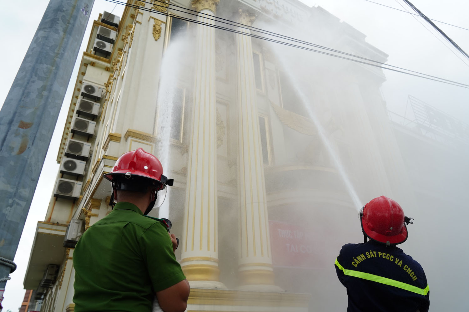 Nhận được tin báo, lực lượng Cảnh sát PCCC&CNCH Công an thành phố đã huy động 10 CBCS, 2 xe chữa cháy, 1 xe thang tổ chức cứu nạn, cứu hộ và triển khai đội hình phun nước làm mát ngăn cháy lan, tránh sụp đổ cấu kiện xây dựng; cứu người bị nạn mắc kẹt ra bên ngoài.