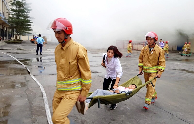 Tình huống giả định: vào hồi 14 giờ, do sự cố từ hệ thống quạt thông gió dẫn đến chập điện gây cháy tại khu để bìa carton, phân xưởng đóng gói, tầng 2, nhà C. Tuy nhiên, lúc xảy cháy hệ thống báo cháy và chữa cháy tự động của chi nhánh đang trong quá trình bảo dưỡng nên không hoạt động. Khi phát hiện đám cháy có diện tích khoảng 50m2 và tiếp tục lan ra xung quanh, theo chiều sâu các thùng, kiện hàng. Tại khu vực khác của xưởng C có khoảng 200 công nhân đang làm việc. Khói và khí độc đã làm 2 công nhân bị ngạt, ngất xỉu, 8 công nhân mắc kẹt tại khu vực đóng gói và tái chế tầng 2.