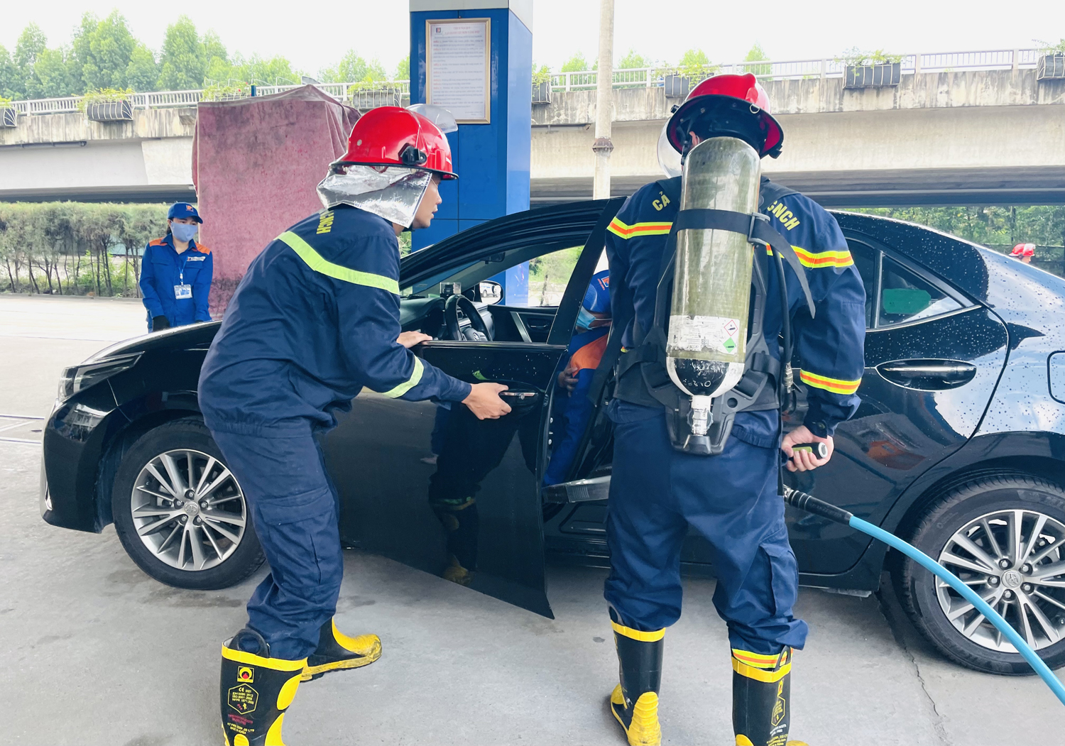 Theo tình huống chữa cháy giả định, tại khu vực Cột bơm xăng A92 - Cửa hàng 61 xảy ra cháy. Nguyên nhân do trong quá trình bơm nhiên liệu cho xe ô tô con loại 4 chỗ phát sinh sự cố, xuất hiện tia lửa bén vào bình chứa chứa xăng của xe làm phát sinh đám cháy. Với tính chất phát triển nhanh của chất cháy xăng A92, xe ô tô bị bốc cháy hoàn toàn. Khi xảy ra cháy, trên xe ô tô có 2 người bị nạn, đã được lực lượng PCCC cơ sở di chuyển đến khu vực an toàn.