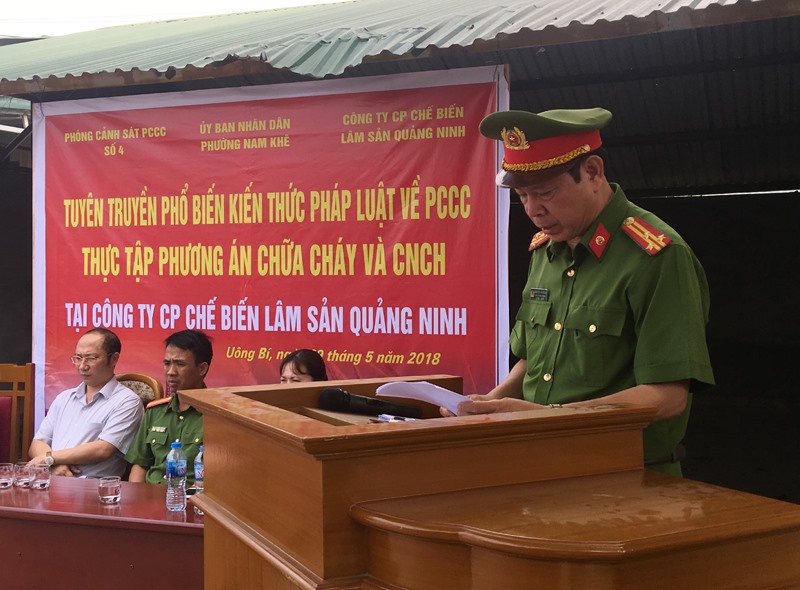 Ngày 9-5, Phòng Cảnh sát PCCC số 4 phối hợp với UBND phường Nam Khê, Công ty CP chế biến lâm sản Quảng Ninh tổ chức thực tập phương án chữa cháy và cứu nạn cứu hộ cho cán bộ công nhân viên tại công ty.
