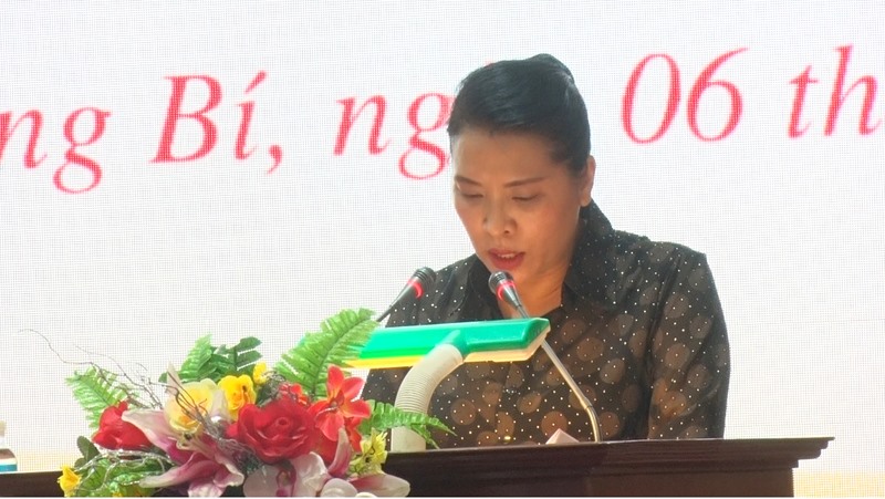 Đồng chí Hoàng Thị Hà, Phó Bí thư Thường trực Thành ủy báo cáo kết quả lãnh đạo việc tổ chức giao ban giữa thường trực cấp ủy với lãnh đạo thôn, khu về công tác Dân vận 6 tháng đầu năm.