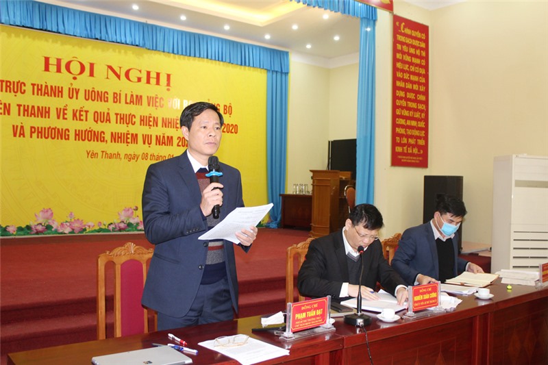 Phát biểu kết luận buổi làm việc, đồng chí Nghiêm Xuân Cường, Tỉnh ủy viên, Bí thư Thành ủy Uông Bí đề nghị: Đảng bộ phường Yên Thanh cần quan tâm triển khai đồng bộ các mặt trong công tác xây dựng đảng; đổi mới nội dung, hình thức các hoạt động khối MTTQ và các đoàn thể chính trị xã hội gắn với nhiệm vụ chính trị, kinh tế xã hội tại địa phương; phát huy dân chủ gắn với tăng cường kỷ luật kỷ cương, nêu gương trách nhiệm của người đứng đầu. Trong nhiệm vụ phát triển kinh tế - xã hội, đồng chí yêu cầu địa phương tiếp tục tìm kiếm và hỗ trợ các mô hình phát triển kinh tế trên địa bàn phường, tạo điều kiện thuận lợi cho phát triển kinh tế hộ gia đình và khuyến khích việc ứng dụng KHCN vào sản xuất và nuôi trồng thủy sản.