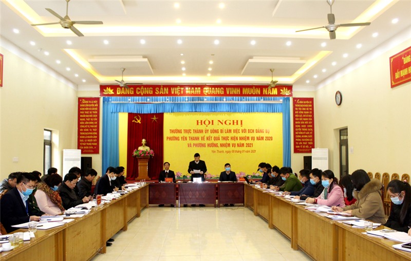 Ngày 8/1, Thường trực Thành ủy Uông Bí đã có buổi làm việc với BCH Đảng bộ phường Yên Thanh về kết quả thực hiện Thông báo kết luận số 1460-TB/TU ngày 07/02/2020 của Thành ủy; việc triển khai thực hiện Nghị quyết 15-NQ/TU ngày 16/12/2020 của Thành ủy về phương hướng nhiệm vụ năm 2021; nghe các đề xuất kiến nghị và những nội dung thuộc thẩm quyền giải quyết của tỉnh, thành phố năm 2021.