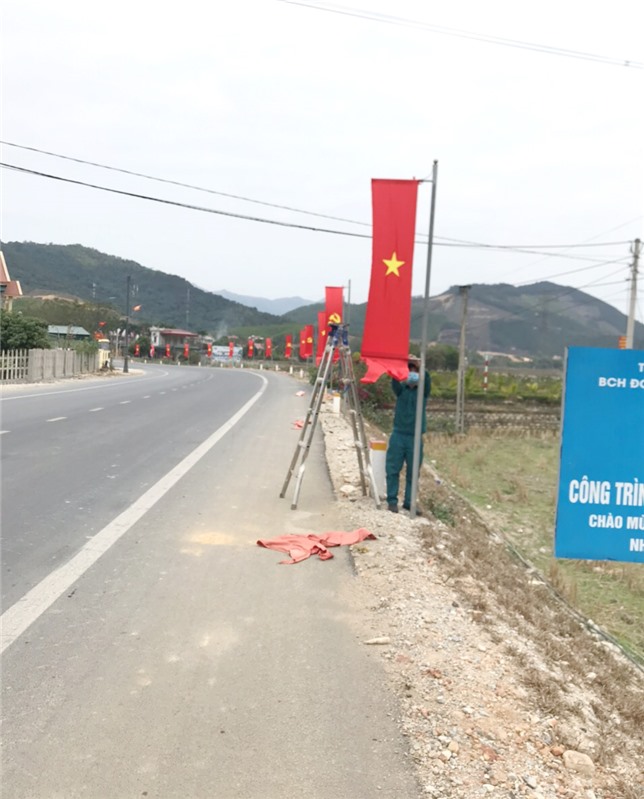 Các tuyến đường xã được trang trí rực rỡ sắc cờ.