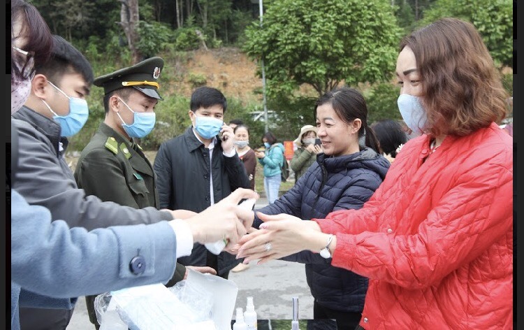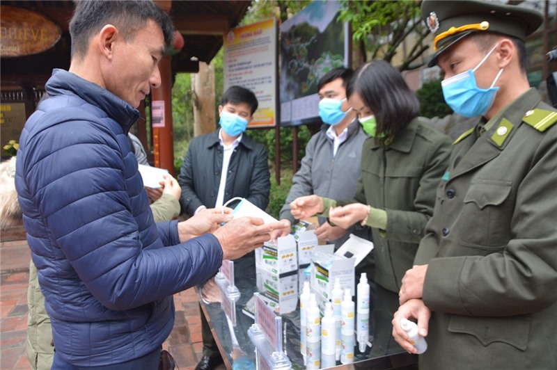 Phát khẩu trang miễn phí, xịt dung dịch rửa tay cho du khách tại Yên Tử
