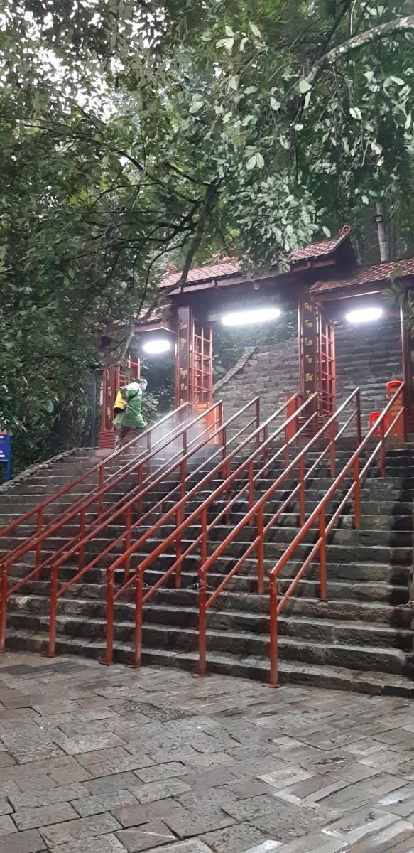 Phun khử trùng khu vực cổng soát vé lên chùa.