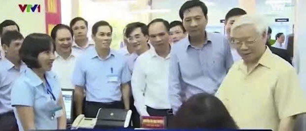 Đồng chí Vũ Thị Hồng Nhung Bí thư đảng bộ phường Quang Trung đón Tổng Bí thư về thăm phường Nam Khê năm 2016.