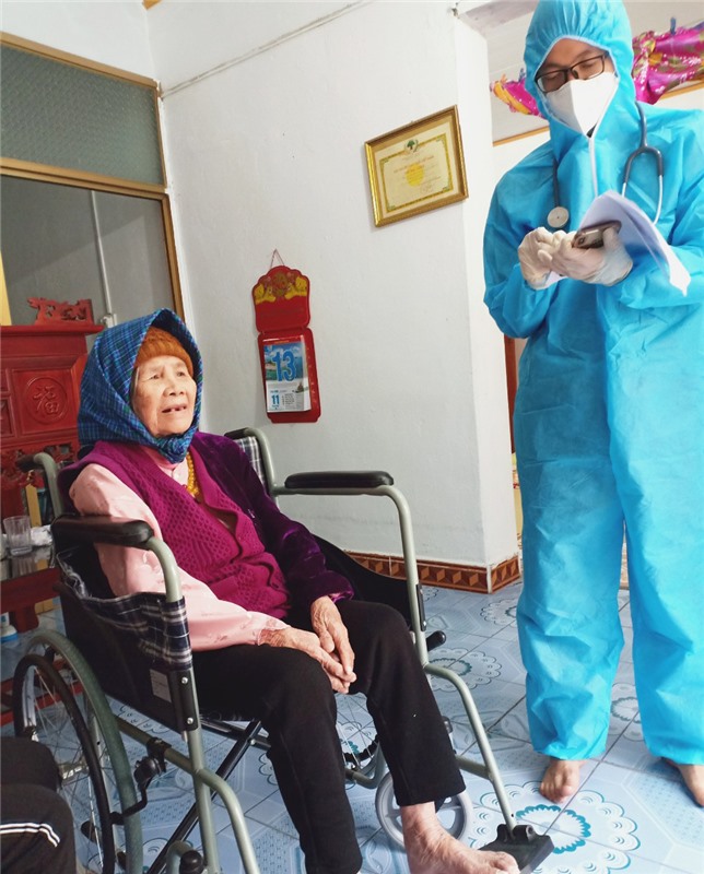 Tổ tiêm vắc-xin lưu động phường Quang Trung, TP Uông Bí, tới thăm khám và tiêm cho cụ Phạm Thị Thi, sinh năm 1932.