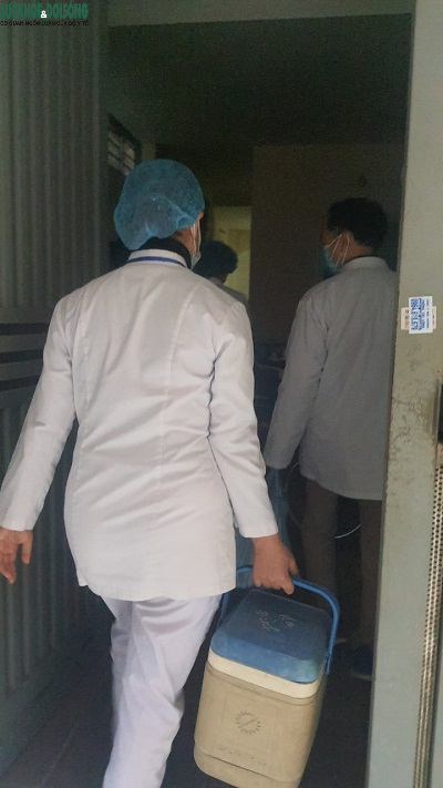Lực lượng thanh niên và dân phòng hỗ trợ các nhân viên y tế đưa các dụng cụ tiêm chủng đến nhà dân.
