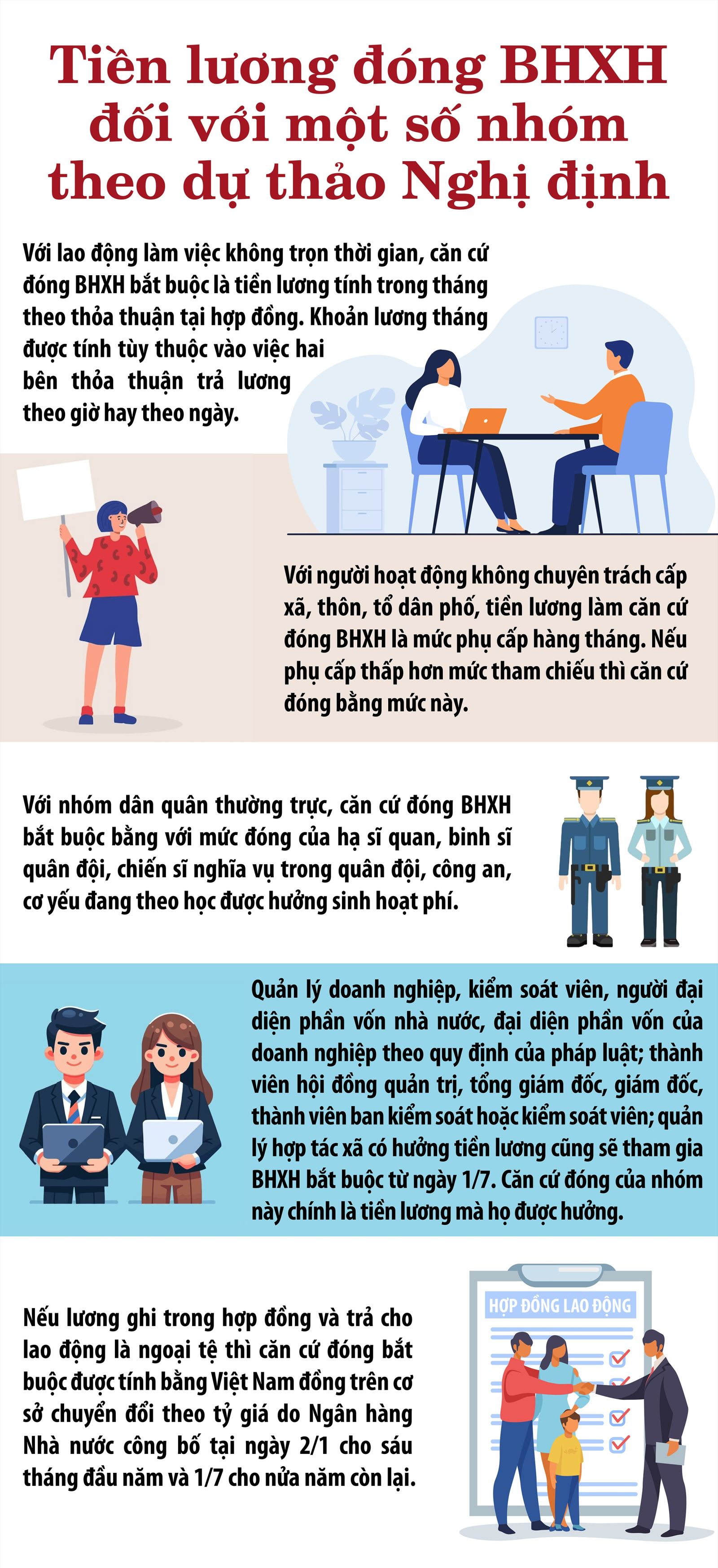 Dự thảo nêu rõ với lao động trong doanh nghiệp, tiền lương làm căn cứ đóng BHXH bắt buộc là tiền lương tháng gồm mức lương theo công việc hoặc chức danh, phụ cấp lương và các khoản bổ sung khác được thỏa thuận trả thường xuyên, ổn định trong mỗi kỳ chi trả.