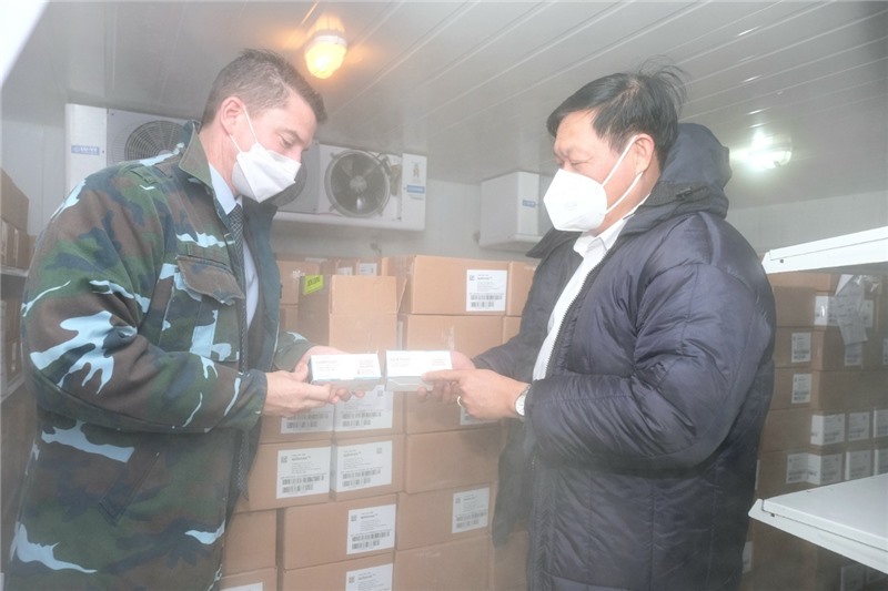 Thứ trưởng Đỗ Xuân Tuyên cùng ông ông Mark Tattersall tại kho lạnh bảo quản vaccine Moderna Ảnh: Trần Minh