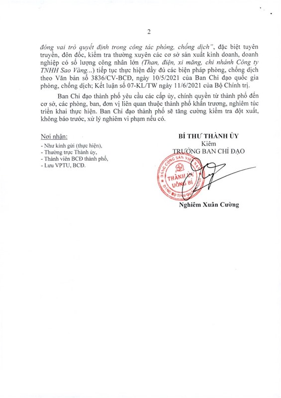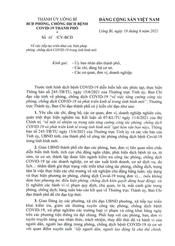 Mới đây, Thường trực Thành ủy-BCĐ phòng, chống dịch bệnh COVID-19 thành phố đã ban hành văn bản số 05/CV-BCĐ về việc tiếp tục triển khai các biện pháp phòng, chống dịch COVID-19 trong tình hình mới.