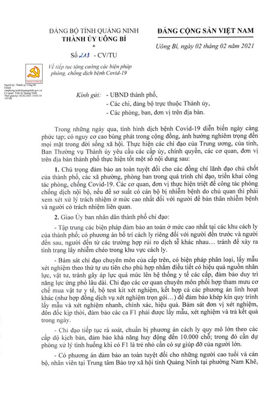 Vừa qua, Ban Thường vụ Thành ủy đã ban hành Công văn số 213-TU/CV về việc tiếp tục tăng cường các biện pháp phòng, chống dịch bệnh Covid-19.