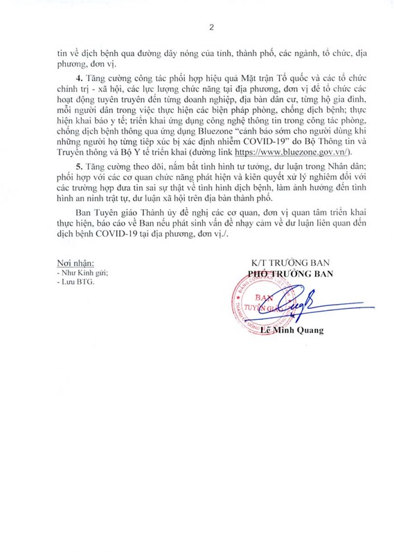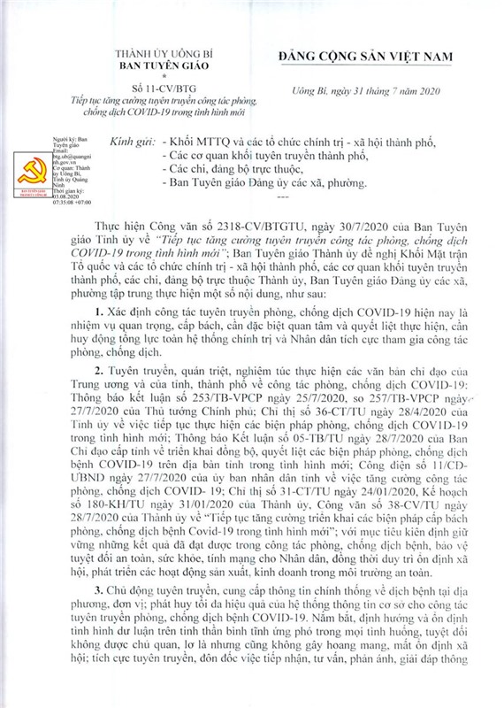 Ngày 31/7/2020 Thành ủy Uông Bí - Ban Tuyên giáo Thành ủy Uông Bí ban hành Công văn số 11-CV/BTG: tiếp tục tăng cường tuyên truyền công tác phòng, chống dịch Coivd-19 trong tình hình mới