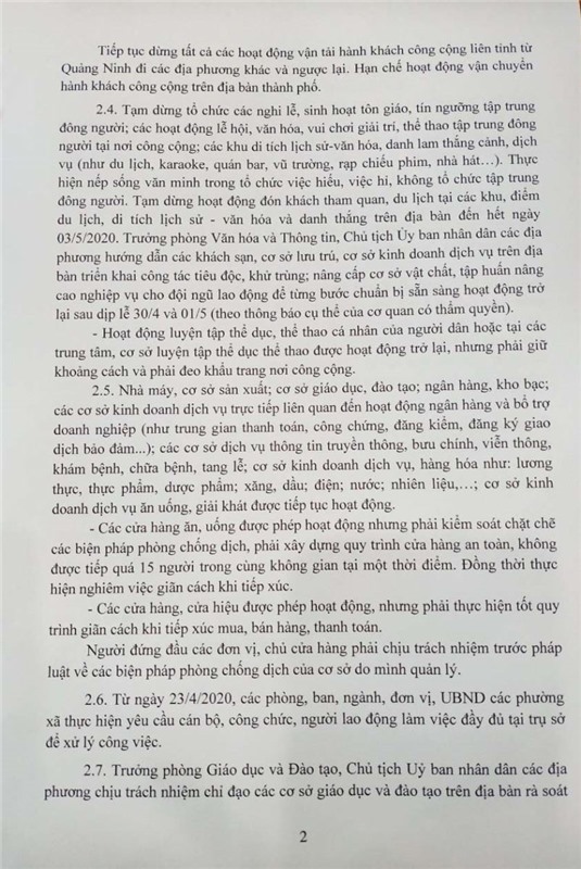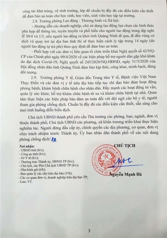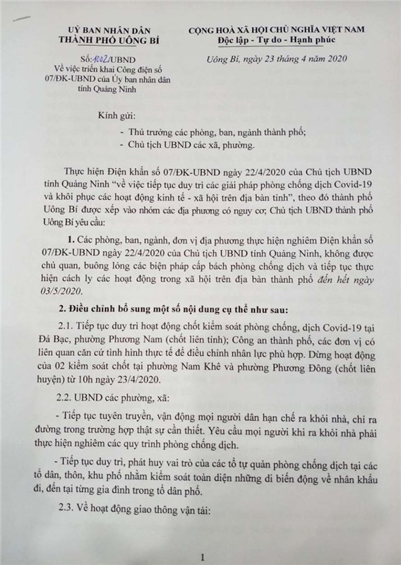 Ngày 23-4, UBND thành phố Uông Bí đã ban hành Công văn sô 1002/UBND về việc triển khai Công điện số 07/ĐK-UBND của Ủy ban nhân dân tỉnh Quảng Ninh.