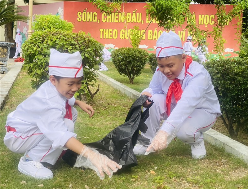 Đoàn đại biểu Trường tiểu học Quang Trung tiến hành dọn vệ sinh, chăm sóc khuôn viên Di tích lịch sử lưu niệm sự kiện Bác Hồ về thăm Uông Bí.