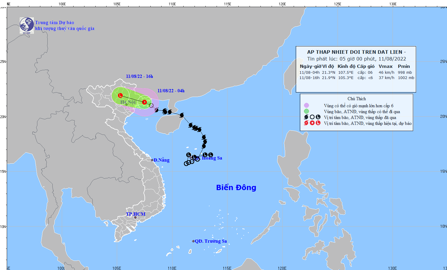 Hồi 04 giờ ngày 11/8, vị trí tâm áp thấp nhiệt đới ở vào khoảng 21,3 độ Vĩ Bắc; 107,5 độ Kinh Đông, trên khu vực các tỉnh Quảng Ninh-Hải Phòng. Sức gió mạnh nhất vùng gần tâm áp thấp nhiệt đới mạnh cấp 6 (39-49km/giờ), giật cấp 8. Bán kính gió mạnh cấp 6, giật cấp 8 khoảng 70km tính từ tâm áp thấp nhiệt đới.