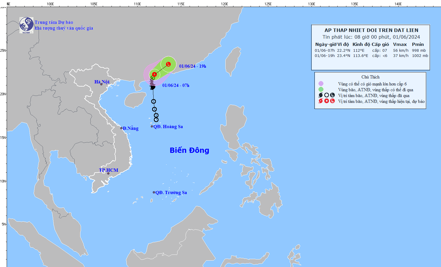 Hồi 07 giờ ngày 01/6, vị trí tâm áp thấp nhiệt đới ở vào khoảng 22,2 độ Vĩ Bắc; 112,0 độ Kinh Đông, trên đất liền phía Nam tỉnh Quảng Đông (Trung Quốc). Sức gió mạnh nhất vùng gần tâm áp thấp nhiệt đới mạnh cấp 6-7 (39-61km/h), giật cấp 9; di chuyển theo hướng Đông Bắc với tốc độ 10-15km/h.