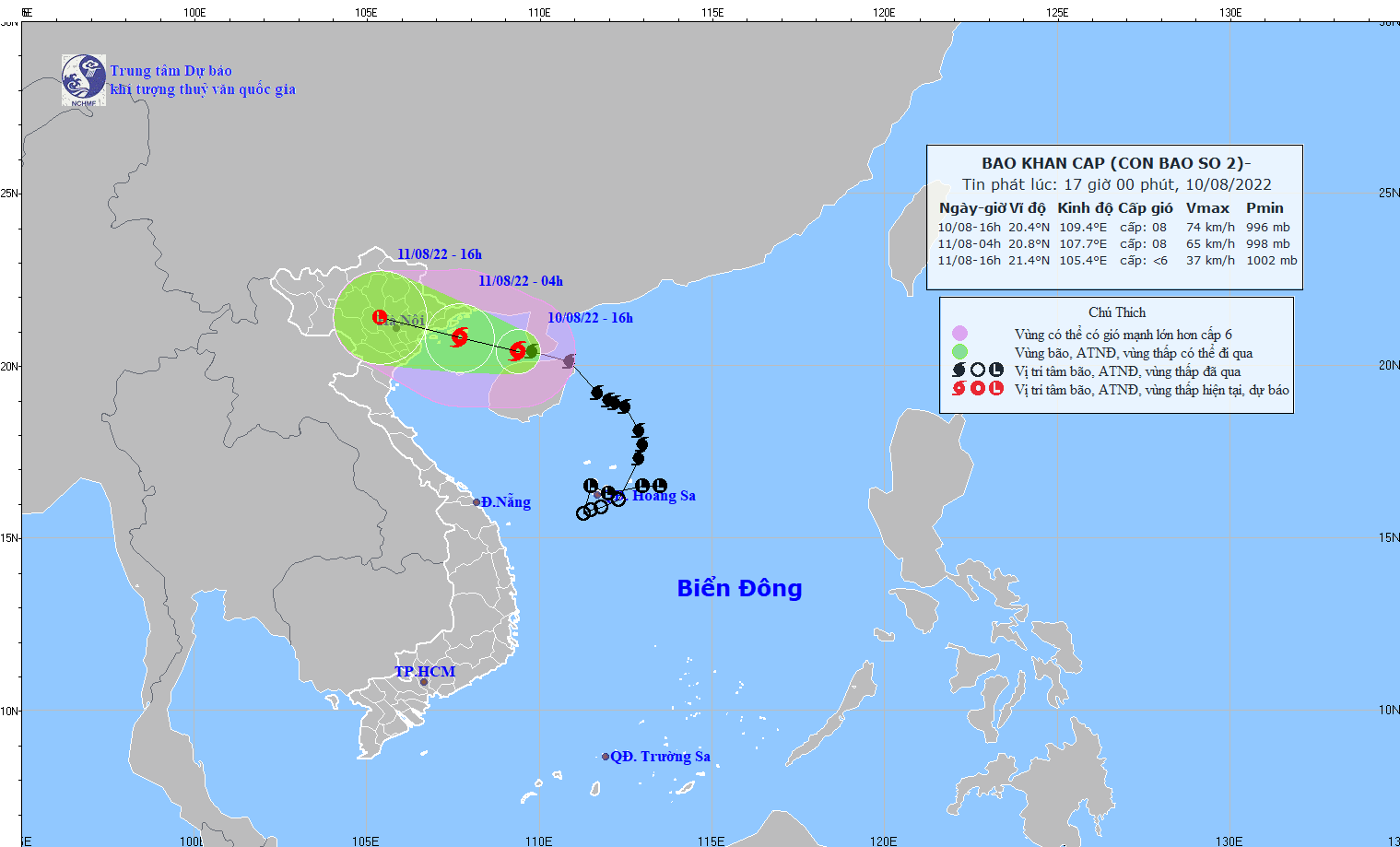Dự báo trong 12 giờ tới, bão di chuyển chủ yếu theo hướng Tây Tây Bắc, mỗi giờ đi được 15-20km. Đến 04 giờ ngày 11/8, vị trí tâm bão ở khoảng 20,8 độ Vĩ Bắc; 107,7 độ Kinh Đông, trên vùng biển Quảng Ninh-Nam Định. Sức gió mạnh nhất vùng gần tâm bão mạnh cấp 8 (62-74km/giờ), giật cấp 10.