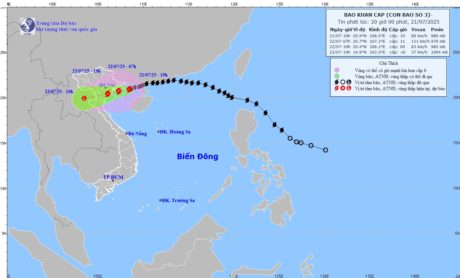 07h ngày 22/7: Vị trí 20,7°N – 107,3°E, trên vùng biển Quảng Ninh đến Ninh Bình; mạnh cấp 10–11, giật cấp 14.