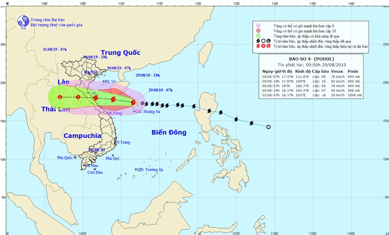 Hồi 07 giờ ngày 29/8, vị trí tâm bão ở vào khoảng 17,4 độ Vĩ Bắc; 111,6 độ Kinh Đông, trên khu vực phía Bắc quần đảo Hoàng Sa, cách đất liền các tỉnh Nghệ An-Quảng Bình khoảng 550km về phía Đông. Sức gió mạnh nhất vùng gần tâm bão mạnh cấp 9 (75-90km/giờ), giật cấp 11. Bán kính gió mạnh cấp 6, giật cấp 8 trở lên khoảng 120km tính từ tâm bão.