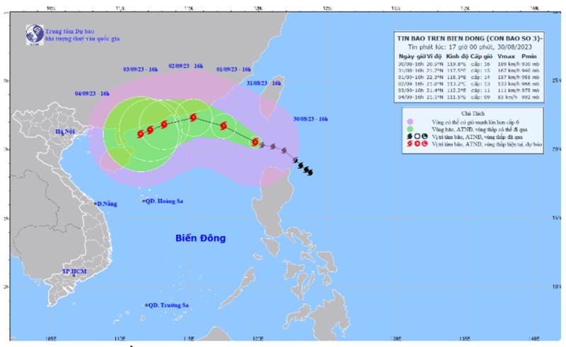 Bản đồ đường đi của bão phát lúc 17h00, ngày 30/8/2023