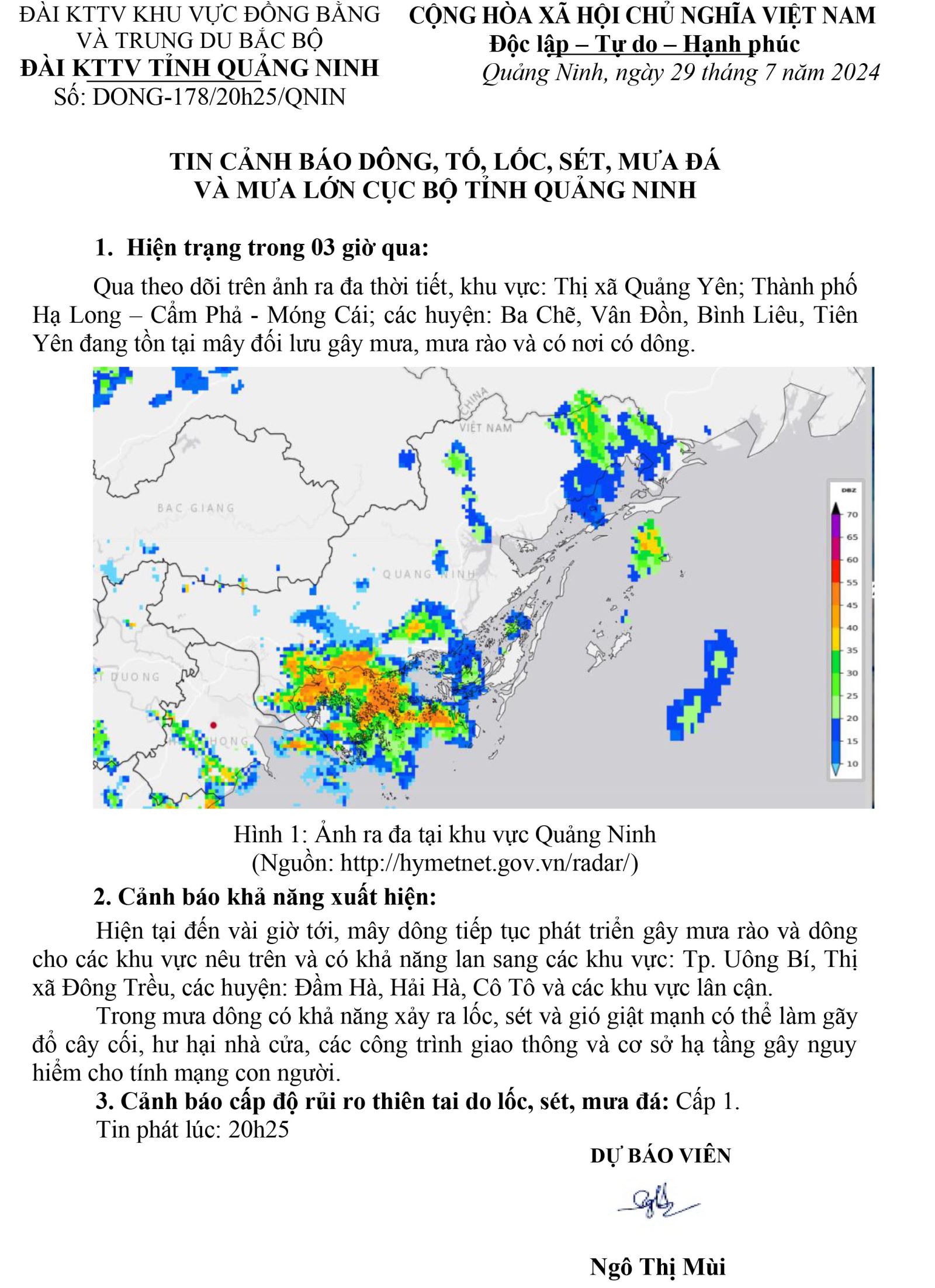 Tin cảnh báo dông, tố, lốc, sét, mưa đá và mưa lớn cục bộ tỉnh Quảng Ninh