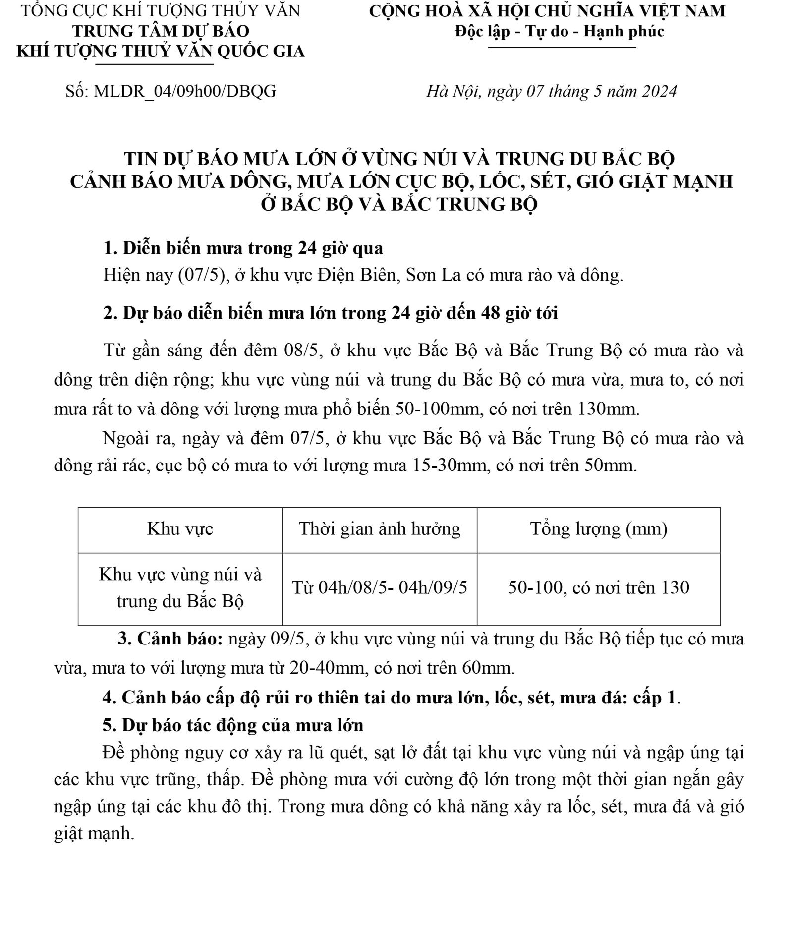 Tin dự báo mưa lớn ở vùng núi và Trung du Bắc Bộ cảnh báo mưa dông, mưa lớn cục Bộ, lốc, sét, gió giật mạnh ở Bắc Bộ và Bắc Trung Bộ