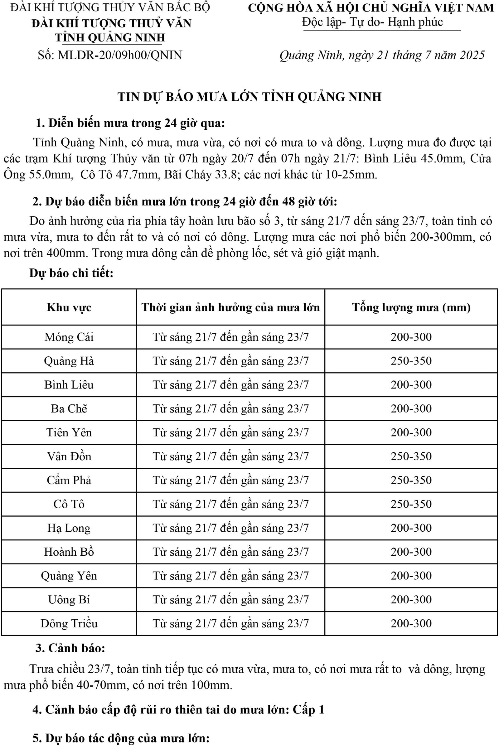 Tin dự báo mưa lớn tỉnh Quảng Ninh