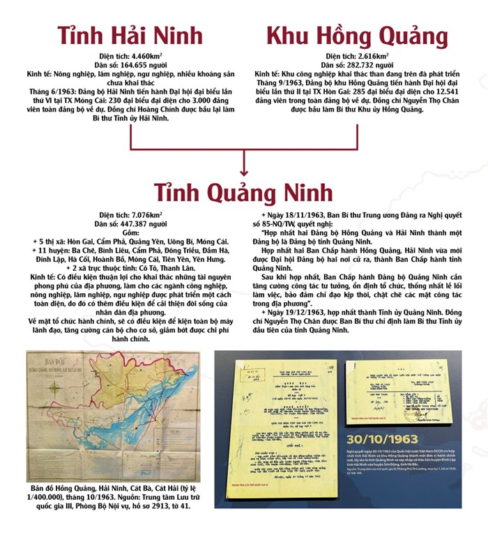 60 năm trước, theo nguyện vọng của Đảng bộ và nhân dân khu Hồng Quảng và tỉnh Hải Ninh, ngày 30/10/1963, tại Kỳ họp thứ 7, Khoá II, Quốc hội đã ra nghị quyết phê chuẩn việc hợp nhất tỉnh Hải Ninh và khu Hồng Quảng thành tỉnh Quảng Ninh. Tỉnh Quảng Ninh được thành lập là dấu mốc quan trọng, tạo thuận lợi cho sự lãnh đạo tập trung của Đảng, Nhà nước đối với vùng đất phên dậu khu vực phía Đông Bắc của Tổ quốc, đồng thời cũng tạo cho Quảng Ninh vị thế và sức bật mới để vươn lên...