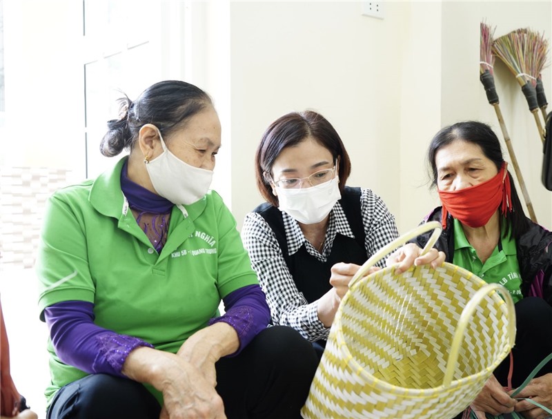 Đoàn công tác của tỉnh hội phụ nữ kiểm tra thực tế mô hình sản phẩm chế tạo từ rác thải nhựa của chi hội phụ nữ khu 5B.