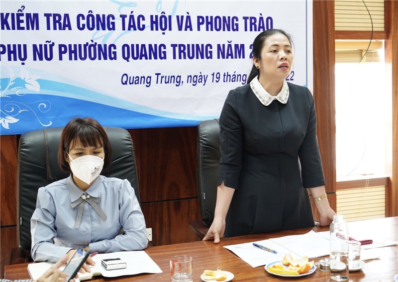 Cũng trong chương trình làm việc, lãnh đạo Hội LHPN phường Quang Trung đã báo cáo với đoàn công tác về kết quả thực hiện nhiệm vụ công tác hội phụ nữ trong quý I/2022. Quý I, cán bộ, hội viên phụ nữ phường đã phát huy tinh thần đoàn kết, thống nhất, tiếp tục đổi mới hoạt động công tác hội, chỉ đạo, điều hành theo hướng có trọng tâm, trọng điểm, hướng mạnh về cơ sở, linh hoạt, sáng tạo trong triển khai thực hiện nhiệm vụ, phù hợp với điều kiện thực tiễn.