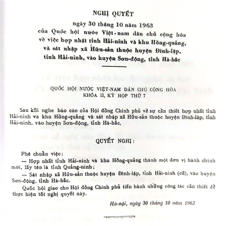 Nghị quyết của Quốc hội khóa II về việc sáp nhập tỉnh Hải Ninh và khu Hồng Quảng thành tỉnh Quảng Ninh, ngày 30/10/1963.