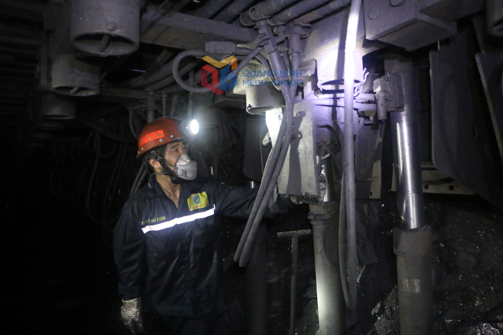 Công nhân Công ty Than Nam Mẫu vận hành hệ thống giàn chống trong lò chợ.