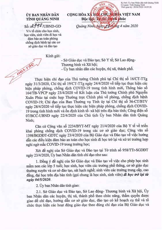 Ủy ban nhân dân tỉnh Quảng Ninh vừa ban hành Công văn số 2748/UBND-GD về việc tổ chức cho học sinh, học viên, sinh viên đi học và đảm bảo an toàn phòng chống dịch bệnh tại các cơ sở giáo dục và đào tạo