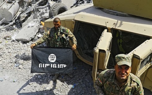 Quân nhân Iraq cầm lá cờ đen IS giữa đống đổ nát tại Thành Cổ Mosul. Ảnh: UPI.