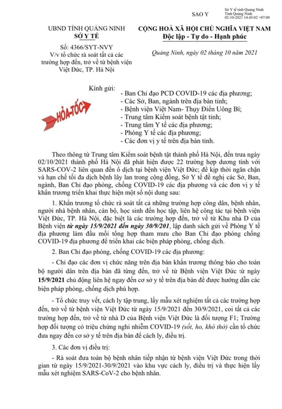 Ngày 2-10 Sở Y tế tỉnh Quảng Ninh ban hành văn bản số 4366/SYT-NVY về việc tổ chức rà soát tất cả các trường hợp đến, trở về từ Bệnh viện Việt Đức, TP Hà Nội.