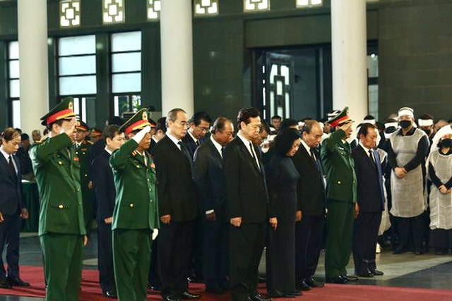 Tổng Bí thư Nguyễn Phú Trọng, nguyên Tổng Bí thư Nông Đức Mạnh, gia đình Thủ tướng Chính phủ Phạm Minh Chính gửi vòng hoa tới viếng.