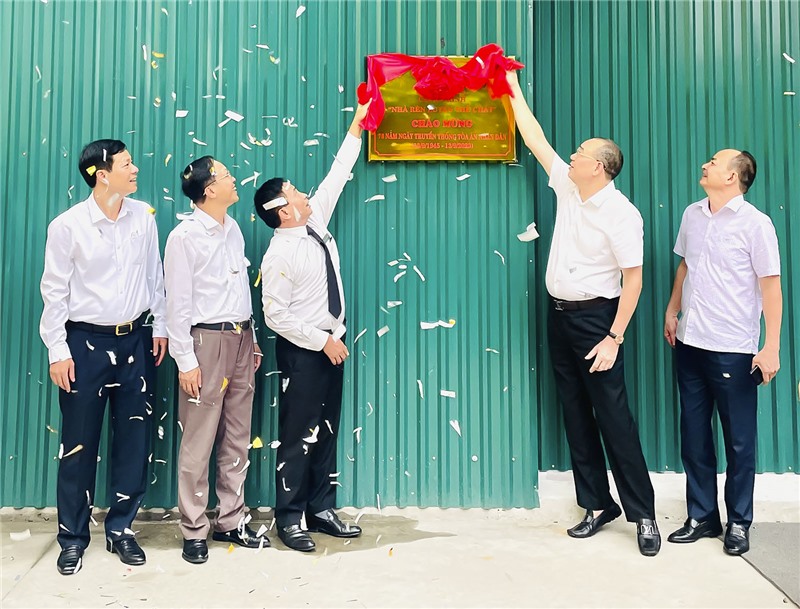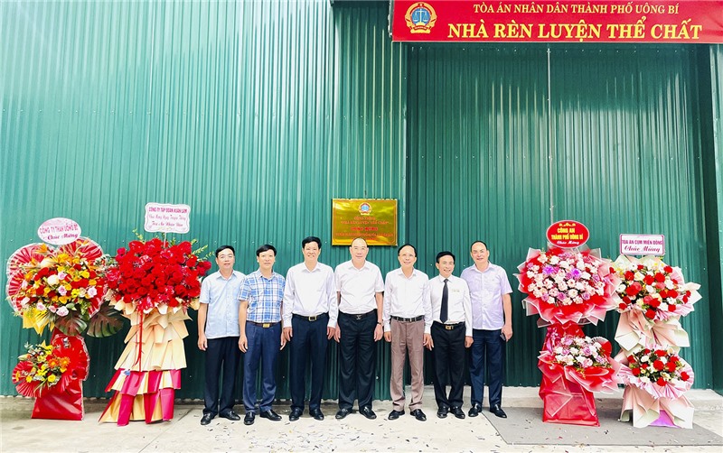 Các đại biểu dự lễ đã tiến hành gắn biển công trình “Nhà rèn luyện thể chất”. Công trình có diện tích 200m2, phục vụ các hoạt động thể dục thể thao của cán bộ, công chức, người lao động Tòa án nhân dân thành phố Uông Bí, thiết thực chào mừng 78 năm Ngày truyền thống Tòa án Nhân dân 13/9 (1945-2023).