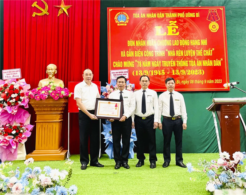 Chiều 8/9, Tòa án Nhân dân thành phố Uông Bí trang trọng tổ chức Lễ đón nhận Huân chương Lao động hạng Nhì và gắn biển công trình “Nhà rèn luyện thể chất” chào mừng 78 năm Ngày truyền thống Tòa án Nhân dân 13/9 (1945-2023). Về dự và chúc mừng, về phía Tòa án Nhân dân tỉnh có đồng chí Hoàng Văn Tiền, Tỉnh ủy viên, Bí thư Ban cán sự Đảng, Chánh án Tòa án Nhân dân tỉnh cùng các đồng chí lãnh đạo trưởng, phó các phòng Toà án nhân dân tỉnh.